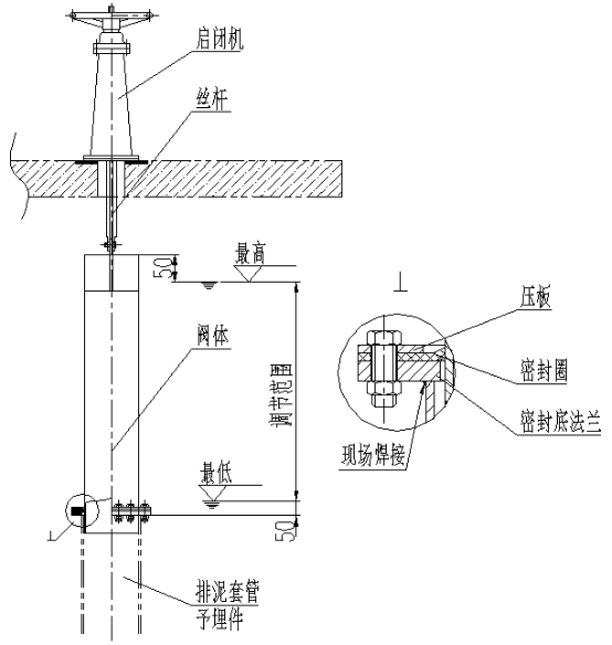套筒排泥閥主要由閥體、密封底法蘭、密封圈、壓板、絲桿、啟閉機等構成如圖所示: