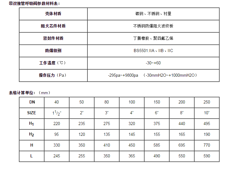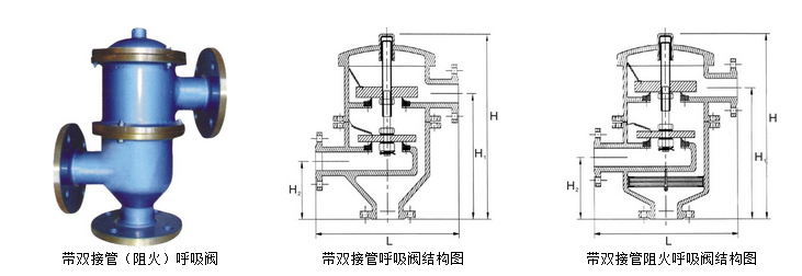 帶雙接管阻火呼吸閥是裝在儲(chǔ)罐頂上起到阻火呼吸作用,它能對(duì)石油儲(chǔ)罐內(nèi)外壓差進(jìn)行自動(dòng)調(diào)節(jié),其性能可靠、穩(wěn)定,完全符合(石油儲(chǔ)罐呼吸閥)SY0511-96、(石油儲(chǔ)罐阻火性能和試驗(yàn)方法)GB5908-86標(biāo)準(zhǔn)。