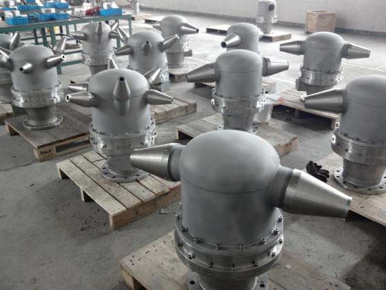 隨位調(diào)合旋轉(zhuǎn)噴頭由噴嘴、集合管、旋轉(zhuǎn)頭、氣囊、杠桿、法蘭、螺栓等組成,材質(zhì)為20#、Q235或不銹鋼,旋轉(zhuǎn)頭為鋁合金或不銹鋼制造。隨位調(diào)合旋轉(zhuǎn)噴頭制造尺寸根據(jù)油罐規(guī)格、油品種類、調(diào)合泵流量等參數(shù)進(jìn)行設(shè)計(jì),確定結(jié)構(gòu)長(zhǎng)度、角度。