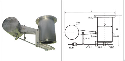 本產品根據油水密度不同的特點,依靠浮筒在油水介質中的浮力差實現截油排水。當沉砂井里有水,且達到一定高度時浮筒上浮,通過杠桿只要較小的力就能將減壓閥打開,并使排水閥芯中的通氣孔打開,水從排水閥流入出水筒內,實現減壓,浮筒繼續上浮,將排水閥打開,水從排水閥進入出水筒內,由出水筒排水。沉砂井內的介質是油時,浮筒下沉,通過杠桿將減壓閥芯的通氣孔閉合,進而將排水閥關閉,阻止油品外泄。當天氣干干旱沉砂井內無水時,排水閥自動保持關閉狀態。當儲油罐區排放系統介質是油水混合狀態時,油水在沉砂井內分層,下部水由排水閥排出,油被截留在沉砂井內,只要收集沉砂井里的油即可。以此,實現了油灌區截油排水完全自動化。